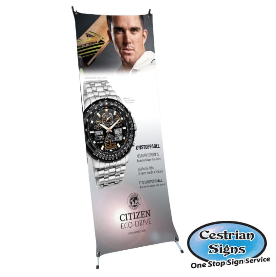 Displays 600 × 1600mm eyeleted banners in a wide range of materials.