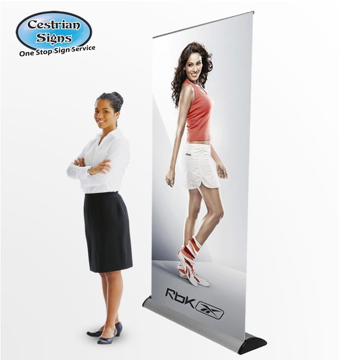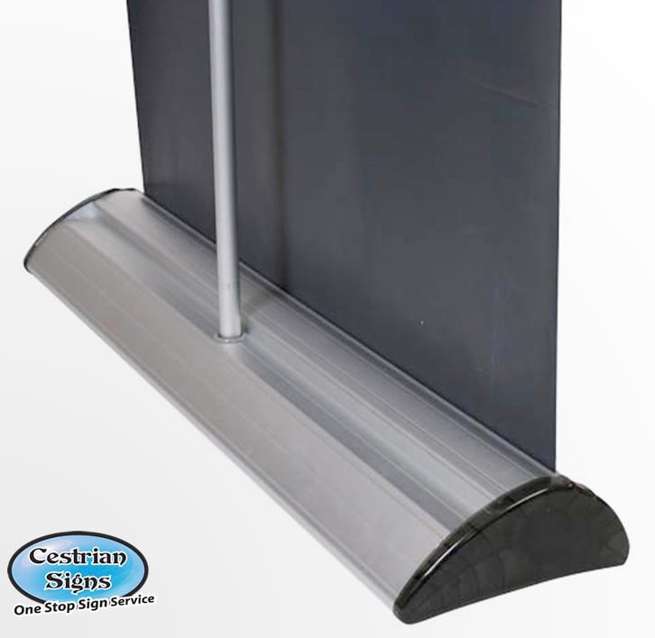Cestrian signs include a TOP QUALITY banner in the price. Whilst most firms provide a cheap laminate print, we print using UV ink onto specially made (for roll-up banners) 170gsm Metamark MD-RU170 plastic-based media. It has a satin-crystal anti-scuff finish and is 99% opaque thanks to the grey ‘lightstop’ backing. UV ink will not smudge/run if you accidentally get it wet as it is waterproof!