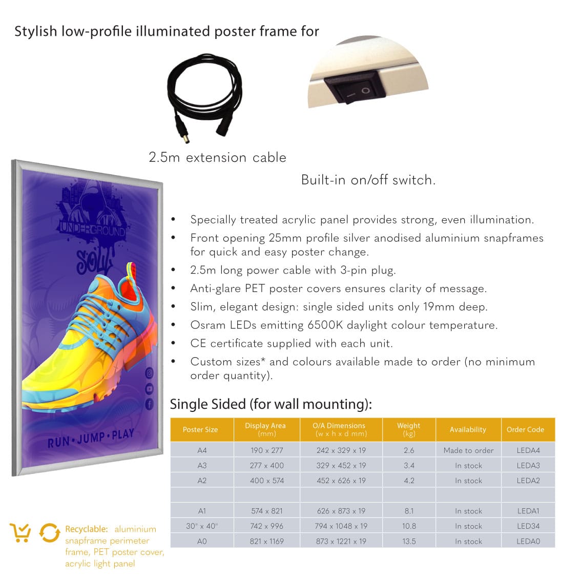 LED snapframe size | 30" x 40" snap frame, A0 snap frame, A1 snap frame, A2 snap frame, A3 snap frame, A4 snap frame |