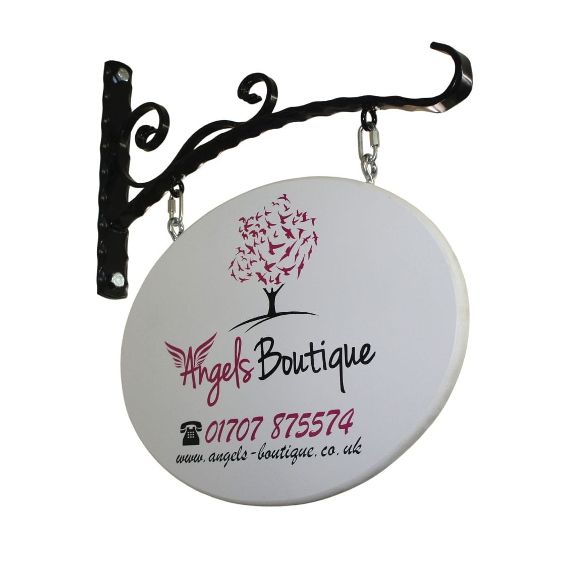 Projecting Hanging Sign 9 500mm. A very pretty little sign bracket, best used with an oval or round shaped signs, ideal for small shops or little arcades where viewing distances are short. Fully customizable with double sided printed signs available.