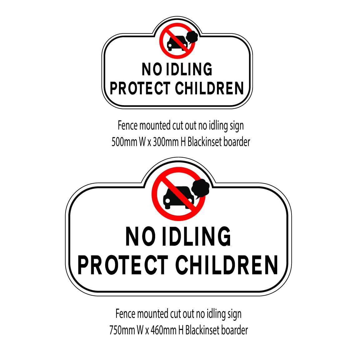 No idling sign size | 500 mm x 300mm fence sign, 750 mm x 460mm fence sign |