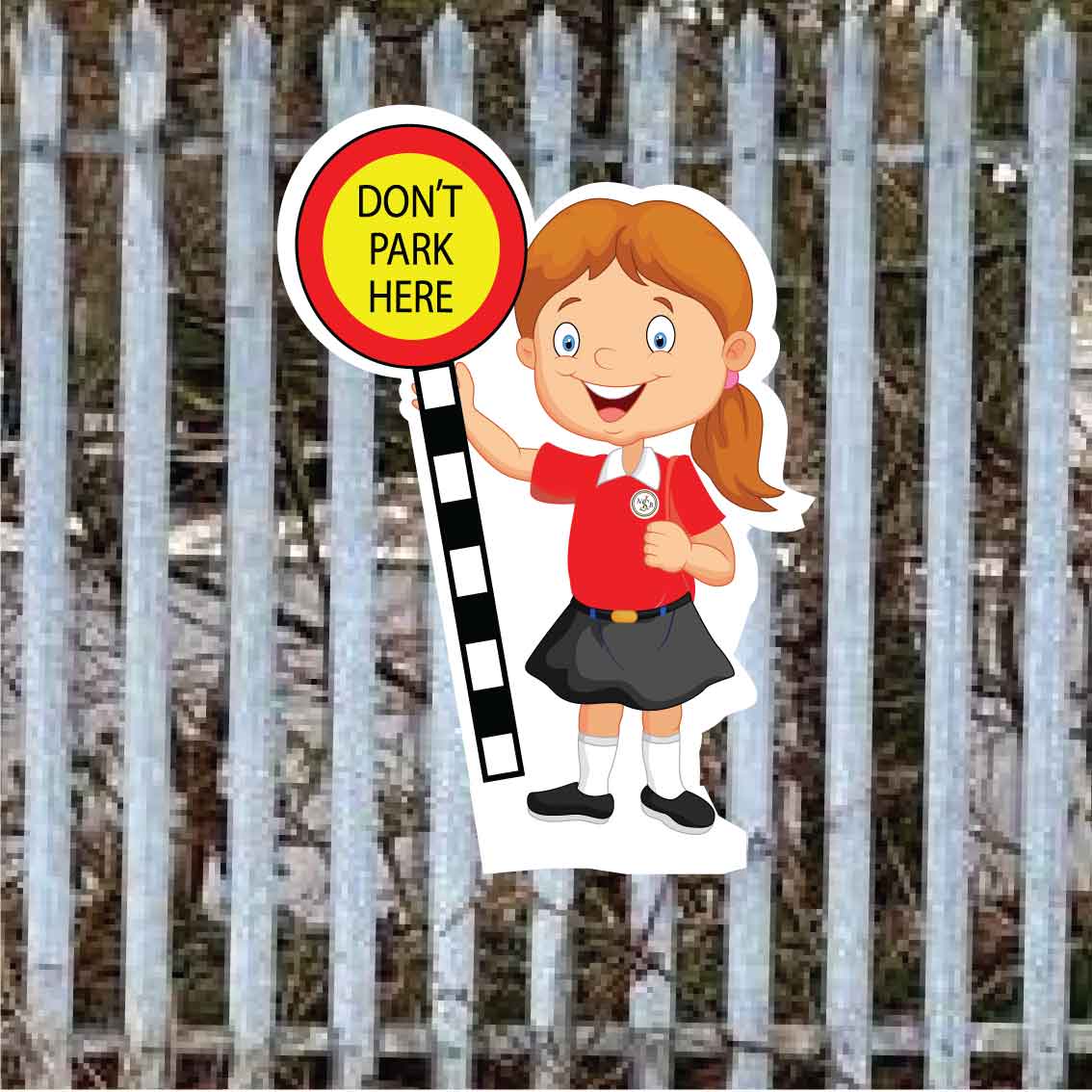 Our cut out kid shaped signs for railings are to be placed on fences near schools when parents are parking.