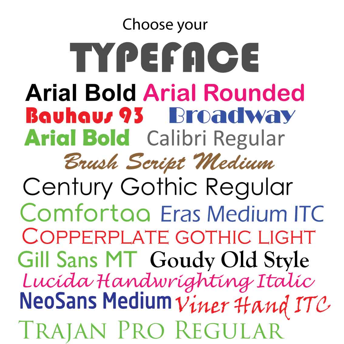 | Type Face (FONT) | Arial Bold, Arial Rounded, Bauhaus 93, Broadway, Choose my own Typeface, Brush Script Medium, Calibri Regular, Century Gothic Regular, Comfortaa, Copperplate gothic light, Gill Sans MT, Eras Medium ITC, Goudy Old Style, Lucida Handwrighting Italic, NeoSans Medium, Trajan Pro Regular, Viner Hand ITC |